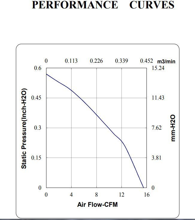 Size (mm) Air Flow (CFM) Size (mm) Air Flow (CFM) 17x17x8 0.7 ~ 0.9 60x60x15 10.8 ~ 21.0 20x20x8 1.3 ~ 1.6 60x60x20 16.0 ~ 30.5 20x20x10 1.5 ~ 1.9